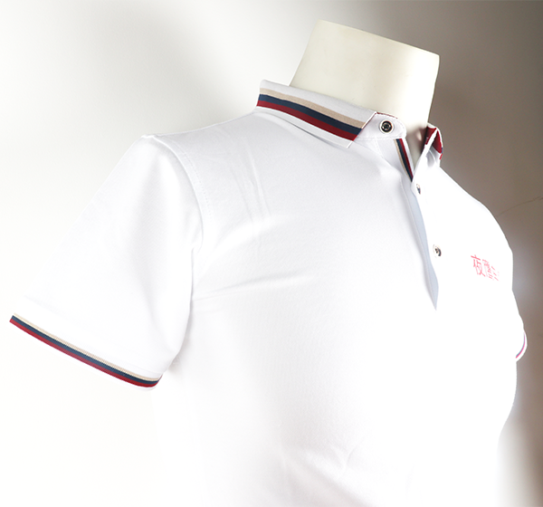 這款工作服主色調(diào)采用白色,在透氣、吸汗上有一定優(yōu)勢(shì),因夜鷹車燈工作人員普遍為男性,所以選擇了T恤的款式,領(lǐng)口和袖口使用藍(lán)紅灰色條紋,簡(jiǎn)約而不失時(shí)尚感,扣子使用子母扣,美觀不易脫落,