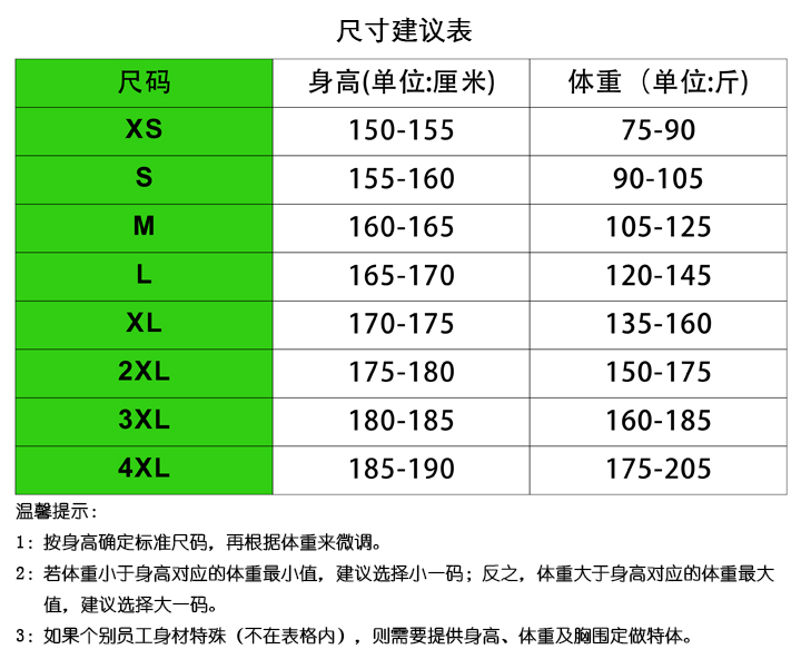 溫馨提示:請(qǐng)對(duì)照每個(gè)員工的身高和體重選擇尺碼,根據(jù)您訂購(gòu)的產(chǎn)品,選擇相應(yīng)的尺碼圖表,先用身高畫出橫線,再用體重畫出豎線,交叉點(diǎn)所在色塊表示合適的尺碼(身高單位:cm,體重單位:kg)