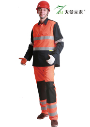 褲子:前門刀防火拉鏈,兩個(gè)斜插褲兜,兩條5CM反光條環(huán)繞褲腿各一周。