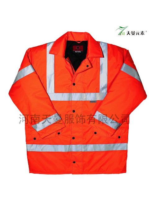 • 產品簡介:產品詳細描述 :   紅色外套面料是純棉,紗織16*12,密度108*56,前門襟一條樹脂拉鏈,五粒四合扣,下擺兜各有一粒四合扣,袖頭有兩粒四合扣。雙肩、腰上、兩袖各有兩條5厘米反光條