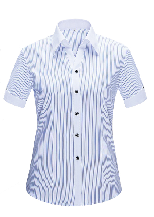 品名:女短袖v領(lǐng)襯衣;版型:修身版;貨號:YWD3006 ;面料:Y3006;顏色:藍(lán)寬細(xì)條紋 ;Fabric:C30/T48/TS22