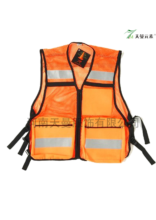 面料:100%純滌綸,配料為桔黃色網(wǎng)眼布,胸前有反光條,下擺兜有二條反條,下兜有兩條尼龍拉鏈,馬甲邊上有黑色邊布。